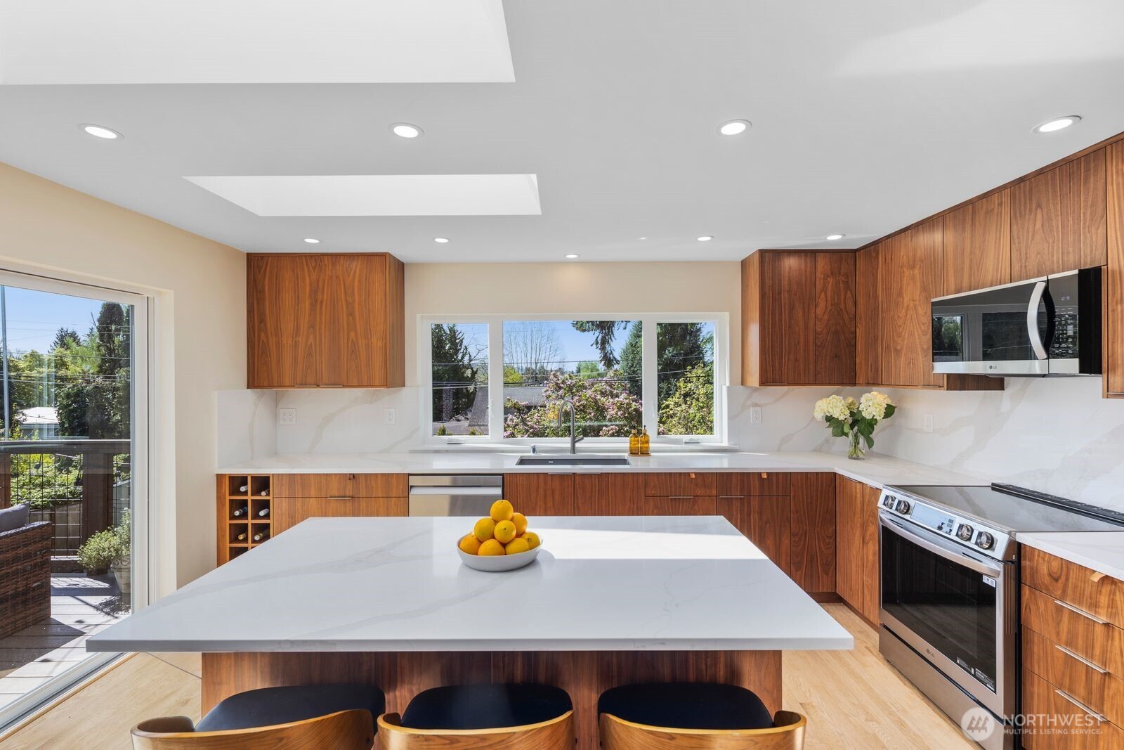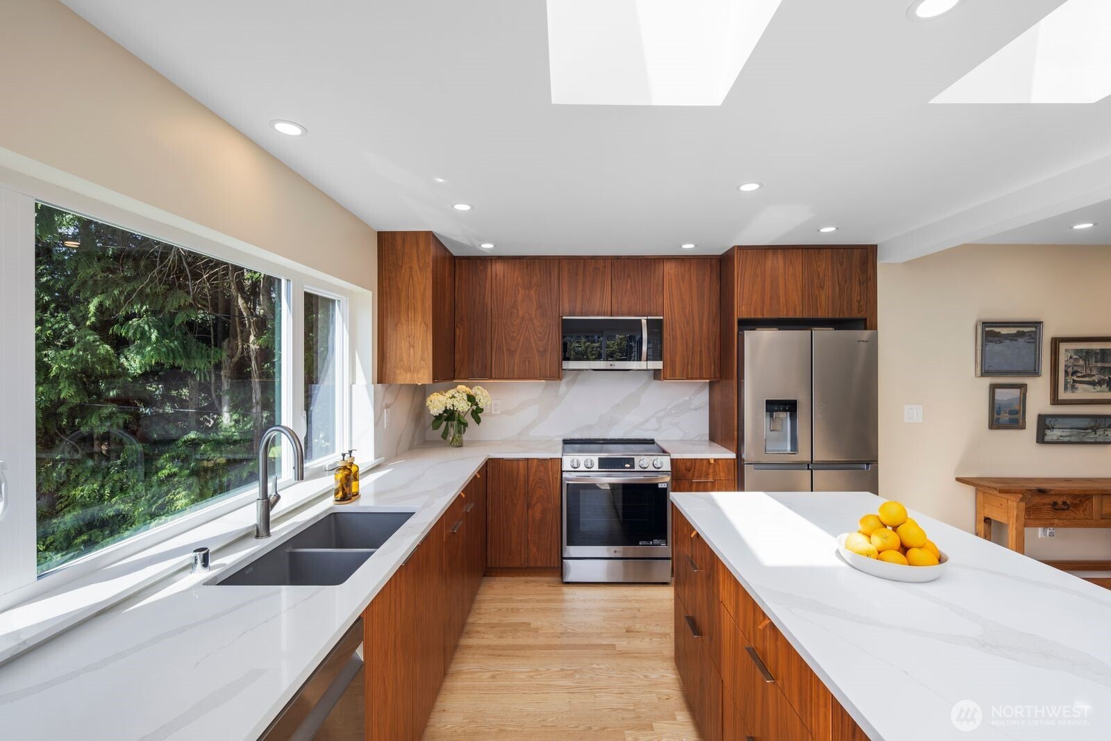 Extensively renovated, this Hawthorne Hills residence blends timeless character with modern design. A thoughtful addition expands the home to include a reimagined kitchen with custom walnut cabinetry and granite countertops, along with a second master suite on the lower level featuring a spa-inspired five-piece bath, complementing the original main-level master. Light-filled interiors offer a functional, multi-level layout with flexible living and guest space. Major upgrades include full rewire, new plumbing, roof, siding, windows, insulation, oil tank decommissioning, and Mitsubishi Hyper Heat systems providing energy-efficient heating and cooling (AC). Landscaped yard with deck and covered patio. Close to top-rated schools, parks, PCC, UW, and Children's Hospital,